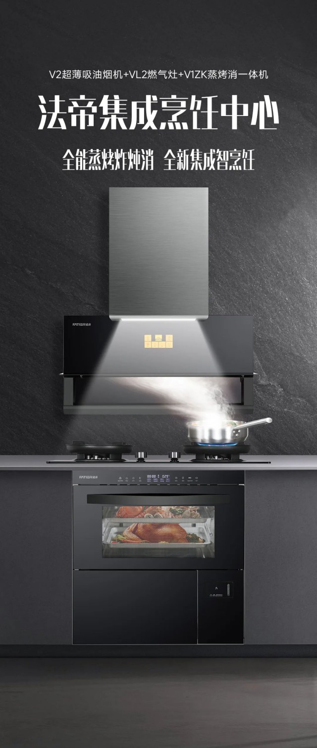 法帝集成烹飪中心集合煙、灶、蒸、烤、保潔等多種功能,實現功能集成、空間集成、智能集成三大集成突破。