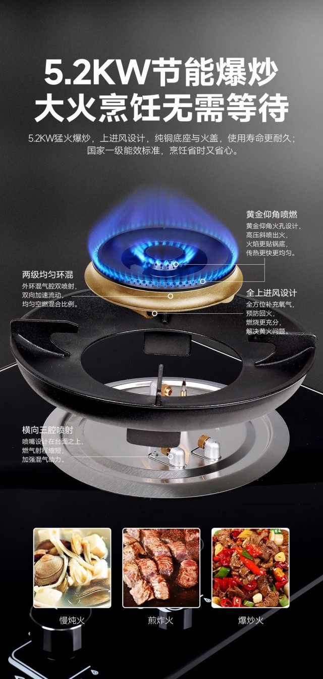 臻薄煙機創新采用低吸上排科技,依循油煙自然升騰的規律,順勢排煙。直流變頻動力系統,智能檢測煙道阻力變化,讓油煙走高速,一路暢行迅速排出。5.2KW寬幅火域聚焰猛火,小火嫩煎精準穩定,猛火爆炒火力十足。