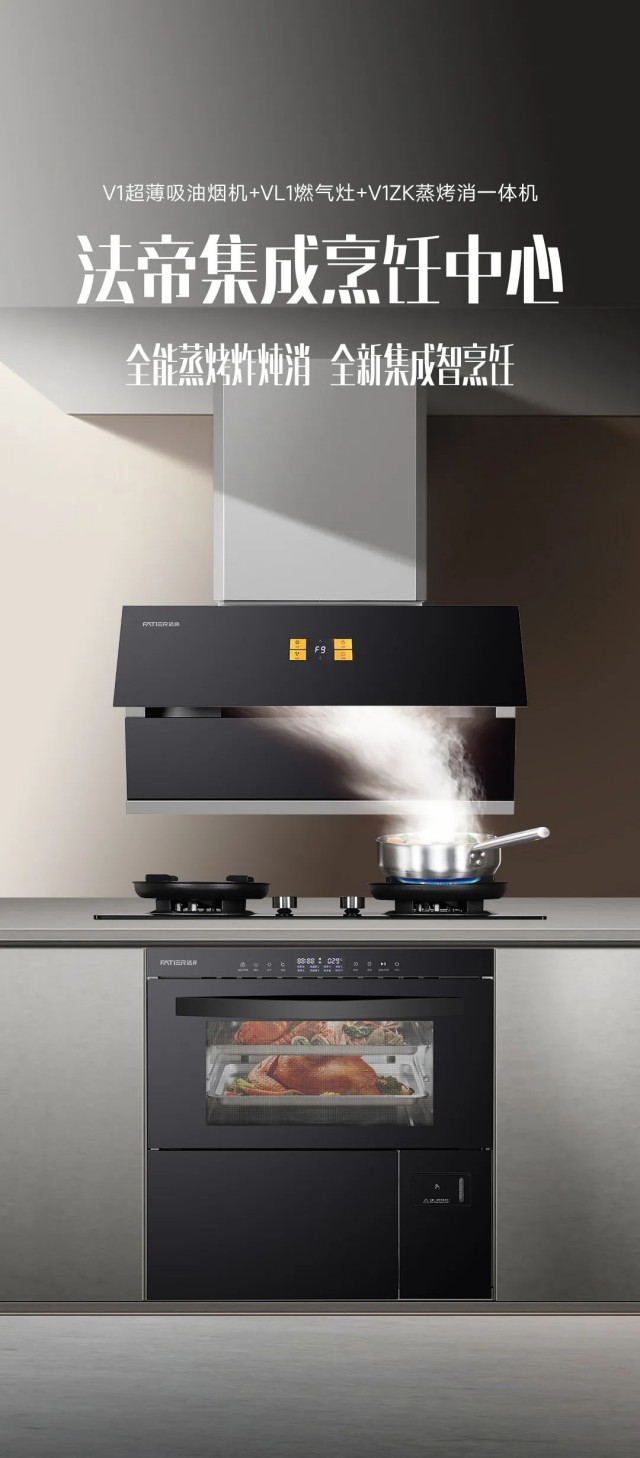 法帝V系列集成烹飪中心,極致簡美集成,方寸之地搭載超薄近吸油煙機+猛火燃氣灶+多功能蒸烤一體機+保潔柜等常見廚電。精致優雅的外觀,適配各種空間風格,從根源上拯救雜亂廚房!