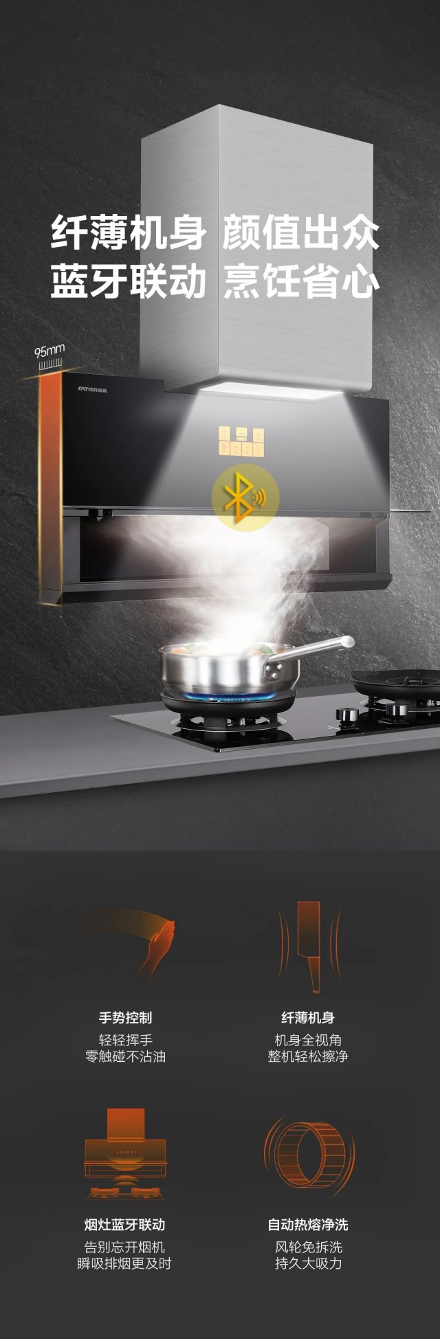 煙烹閃聯科技,達到『風隨火動』的理想效果,煙機灶具同步開啟,凈煙快人一步,杜絕油煙逃竄。